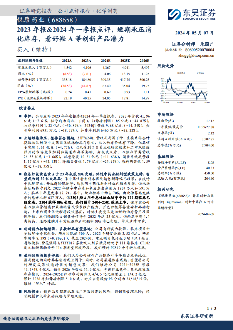 悦康药业(688658):2023年报、2024年一季报点评:短期承压消化库存,看好羟A等创新产品潜力
