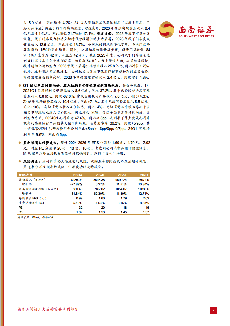 稳健医疗在2023年及2024年一季度受感染防护产品市场需求骤降及库存过剩影响,业绩表现承压,营收和净利润均出现显著下滑。然而,公司通过有效的降本控费措施,成功优化了健康生活消费品业务的毛利率,并保持了常规医用耗材业务的稳健增长。全棉时代品牌在产品优势和线下市场恢复的推动下,展现出强劲的增长势头,尤其是在干湿棉柔巾等核心单品及线下门店扩张方面表现突出。尽管短期内盈利能力因收入结构变化而承压,但分析师预计,随着消费品业务的持续修复和非疫情相关医用耗材的快速增长,公司未来盈利能力将显著改善。基于对公司战略调整和市场前景的积极评估,报告维持“买入”评级,并设定了38.40元的目标价,认为公司具备长期投资价值,但投资者仍需关注原材料价格波动、收购协同、渠道扩张及汇率等潜在风险。