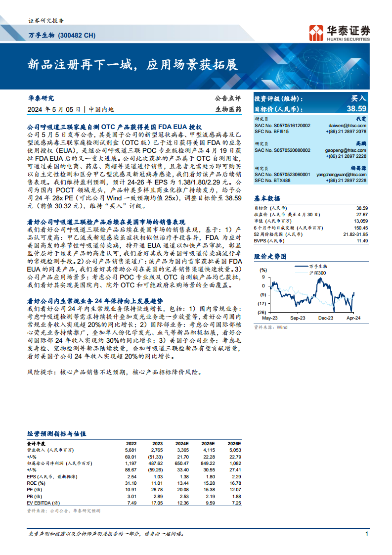 华泰研究维持对万孚生物的盈利预测,预计2024-2026年每股收益(EPS)分别为1.38元、1.80元和2.29元。基于公司作为国内POCT领域龙头,产品种类多样且商业化推广持续发力,研究员给予公司2024年28倍市盈率(PE),高于可比公司Wind一致预期均值25倍,并将目标价调整至38.59元(前值为30.32元)。