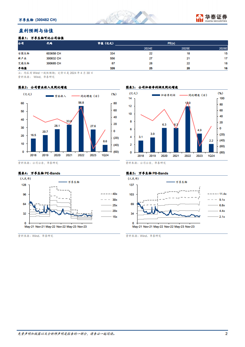 根据华泰研究的预测,万孚生物的营业收入预计将从2023年的2,765百万元增长至2026年的5,053百万元,年复合增长率显著。归属母公司净利润预计将从2023年的487.62百万元增长至2026年的1,082百万元,显示出强劲的盈利增长潜力。2024年、2025年和2026年的归母净利润同比增速分别为33.40%、30.55%和27.41%。在估值方面,给予公司2024年28倍PE,高于可比公司(安图生物、新产业、艾德生物)的平均25倍PE,体现了市场对其未来增长潜力的认可。