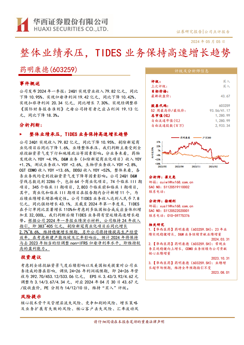 药明康德2024年第一季度业绩整体承压,营业收入和归母净利润同比下降,主要受全球投融资环境和地缘政治因素影响。然而,公司在剔除新冠商业化项目后收入降幅收窄,且扣非净利润实现同比增长,显示出核心业务的韧性。特别是TIDES业务表现强劲,收入和在手订单均实现高速增长,并伴随产能扩张,成为公司未来业绩增长的重要驱动力。尽管面临外部不确定性,公司维持全年收入指引和较高的盈利能力预期。基于对未来增长潜力的评估,报告维持“买入”评级,并调整了2024-2026年的盈利预测,但认为公司估值具有吸引力。同时,报告也提示了多项潜在风险。