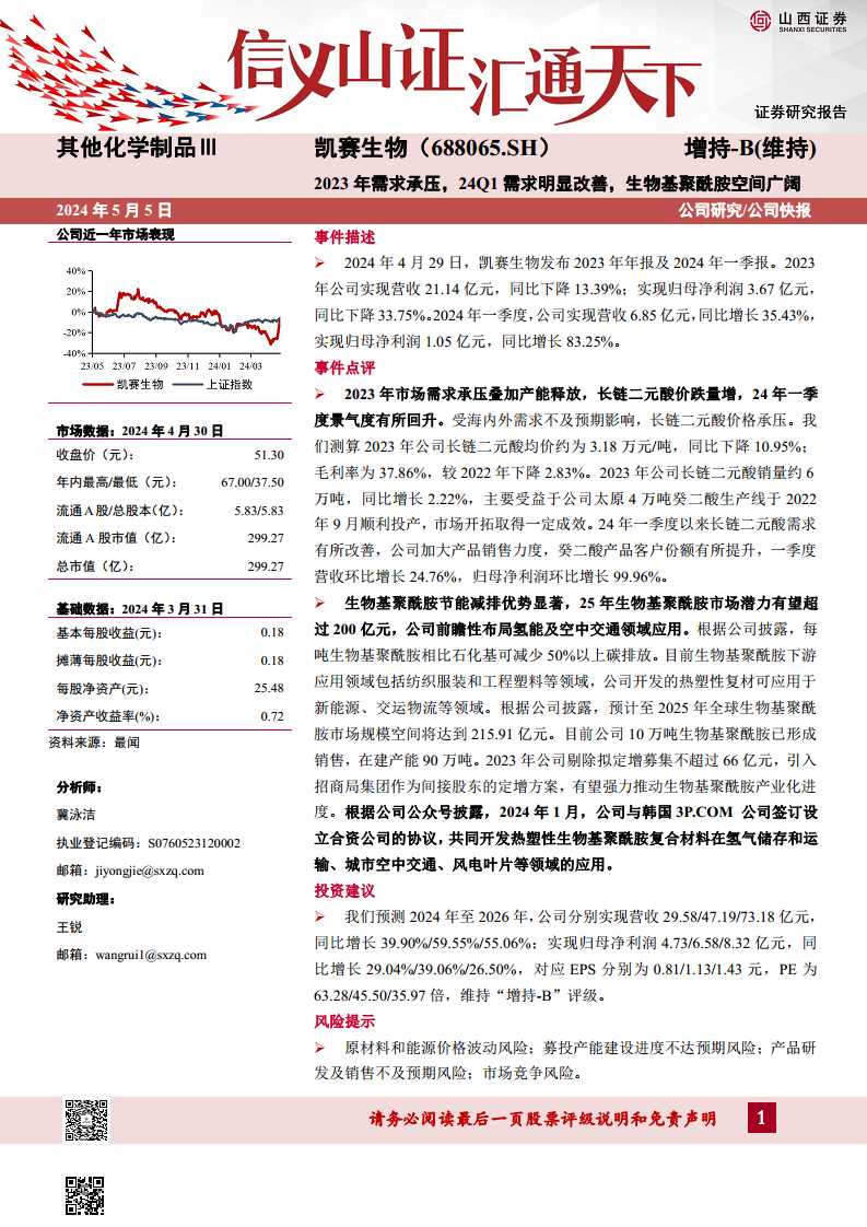 凯赛生物在经历2023年市场需求承压后,于2024年一季度实现了显著的业绩反弹,长链二元酸业务表现出强劲的复苏态势。公司凭借生物基聚酰胺在节能减排方面的独特优势,积极把握其广阔的市场潜力,并通过大规模产能建设、引入战略投资者以及与国际伙伴在氢能、城市空中交通等前沿领域的合作,构建了未来增长的核心驱动力。尽管面临原材料价格波动、产能建设进度及市场竞争等多重风险,但分析师对公司未来三年的营收和净利润增长持乐观预期,并维持“增持-B”评级,凸显了对公司长期发展潜力的认可。