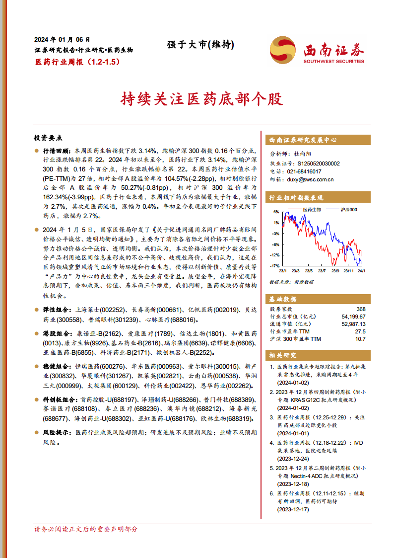 本周医药生物指数表现弱于大盘,估值水平相对A股溢价率有所下降,显示行业短期承压。然而,中药集采结果温和落地,符合市场预期,且行业长期发展仍聚焦于创新、疫后复苏及产业链自主可控三大主线,预示着结构性投资机会。