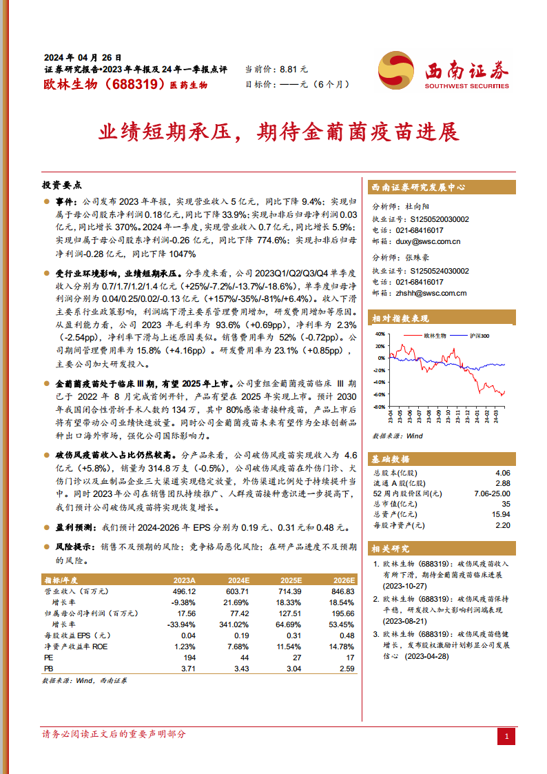 欧林生物在2023年及2024年一季度面临业绩短期承压,主要表现为营收增速放缓和归母净利润下滑,这主要归因于行业政策变化以及公司在管理和研发方面的投入增加。尽管如此,公司核心产品破伤风疫苗仍保持稳定贡献,并在积极的市场推广下有望实现恢复性增长。更重要的是,公司重组金葡菌疫苗的临床III期进展顺利,预计2025年上市后将凭借巨大的市场潜力成为公司未来业绩增长的核心驱动力,并有望拓展国际市场。基于对产品线和研发进展的乐观预期,分析师预测欧林生物在2024-2026年将实现营收和净利润的显著增长,每股收益将大幅提升,盈利能力也将持续改善。投资者需关注销售、竞争和研发进度等潜在风险。
