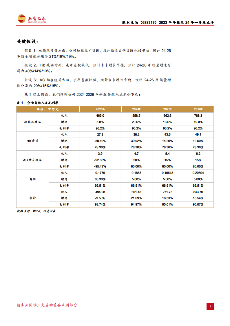基于对公司核心产品市场表现和研发进展的分析,西南证券对欧林生物2024-2026年的财务表现进行了预测。关键假设包括:破伤风疫苗在积极推广下,2024-2026年销量增速分别为21%/19%/19%;Hib疫苗在较低基数下,未来三年销量增速分别为40%/14%/13%;AC结合疫苗在较低基数下,未来三年销量增速分别为20%/15%/15%。