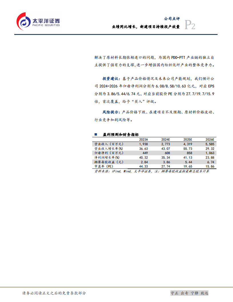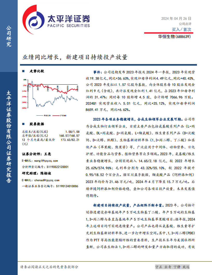 华恒生物在2023年及2024年第一季度取得了显著的业绩增长,营业收入和归母净利润均表现强劲。公司通过氨基酸和维生素业务的稳健发展,以及生物基新材料单体(特别是生物法1,3-丙二醇)的成功投产和产能扩张,有效拓宽了产品线并实现了关键技术的国产替代,为公司未来发展奠定了坚实基础。尽管面临产品价格波动和项目建设等风险,但基于其在合成生物领域的领军地位和持续的创新投入,公司展现出良好的增长潜力和投资价值。