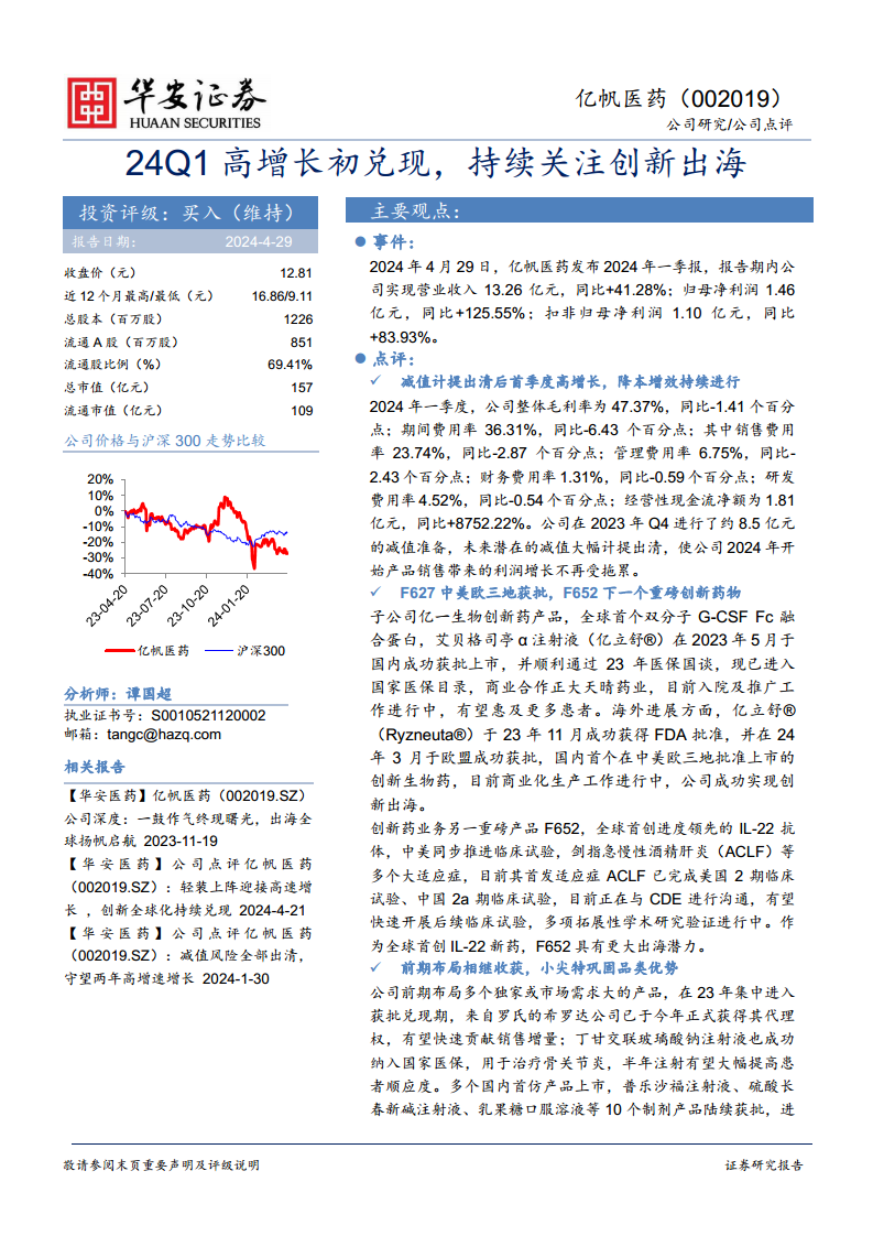 亿帆医药(002019):24Q1高增长初兑现,持续关注创新出海