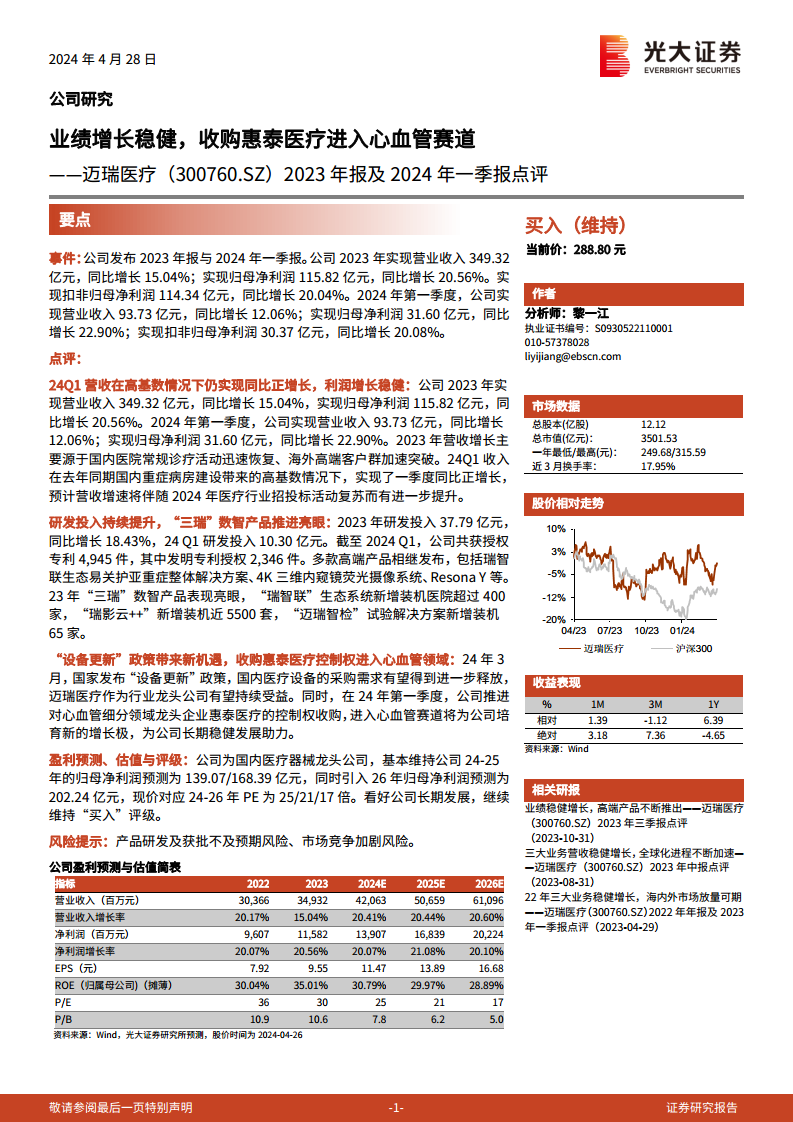 迈瑞医疗(300760):2023年报及2024年一季报点评:业绩增长稳健,收购惠泰医疗进入心血管赛道