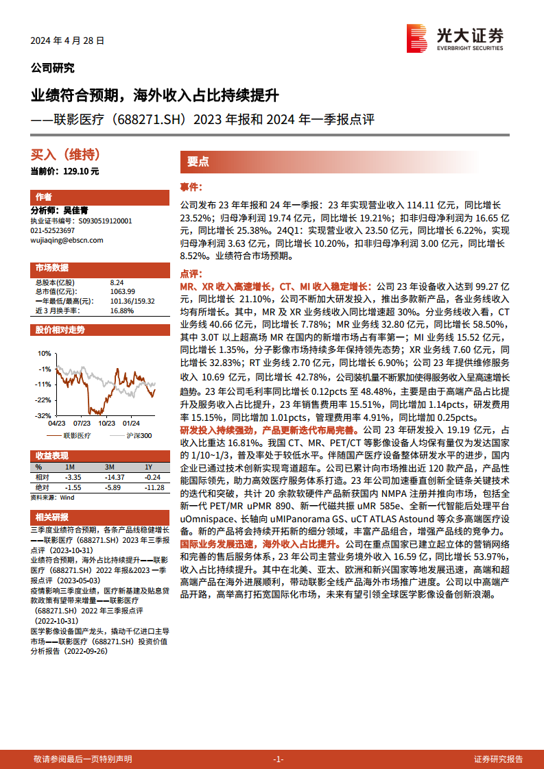 联影医疗发布的2023年年报和2024年一季报显示,公司业绩符合市场预期。