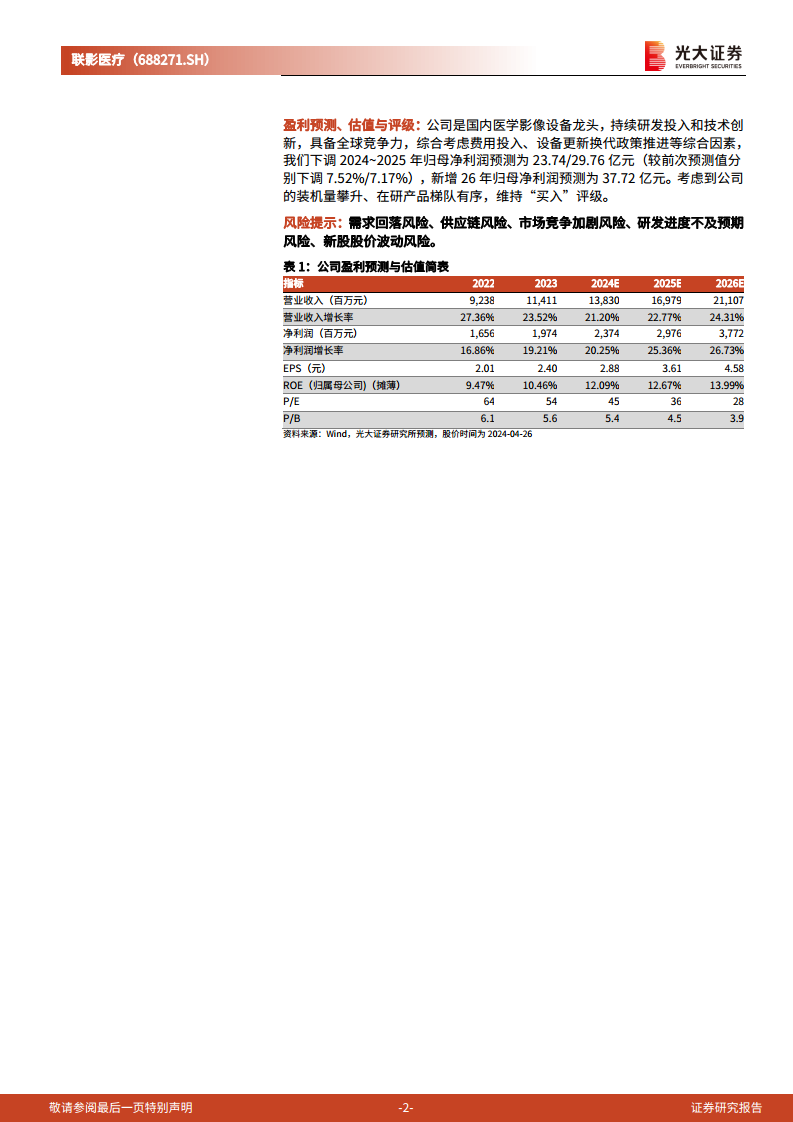 考虑到公司装机量攀升和在研产品梯队有序,光大证券研究所维持联影医疗“买入”评级。同时,报告提示了以下风险:需求回落风险、供应链风险、市场竞争加剧风险、研发进度不及预期风险以及新股股价波动风险。