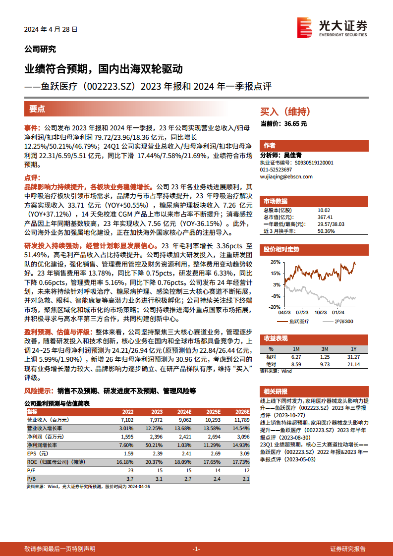 鱼跃医疗(002223):2023年报和2024年一季报点评:业绩符合预期,国内出海双轮驱动