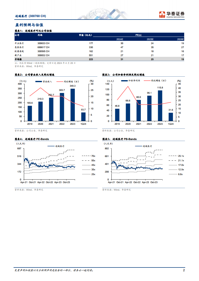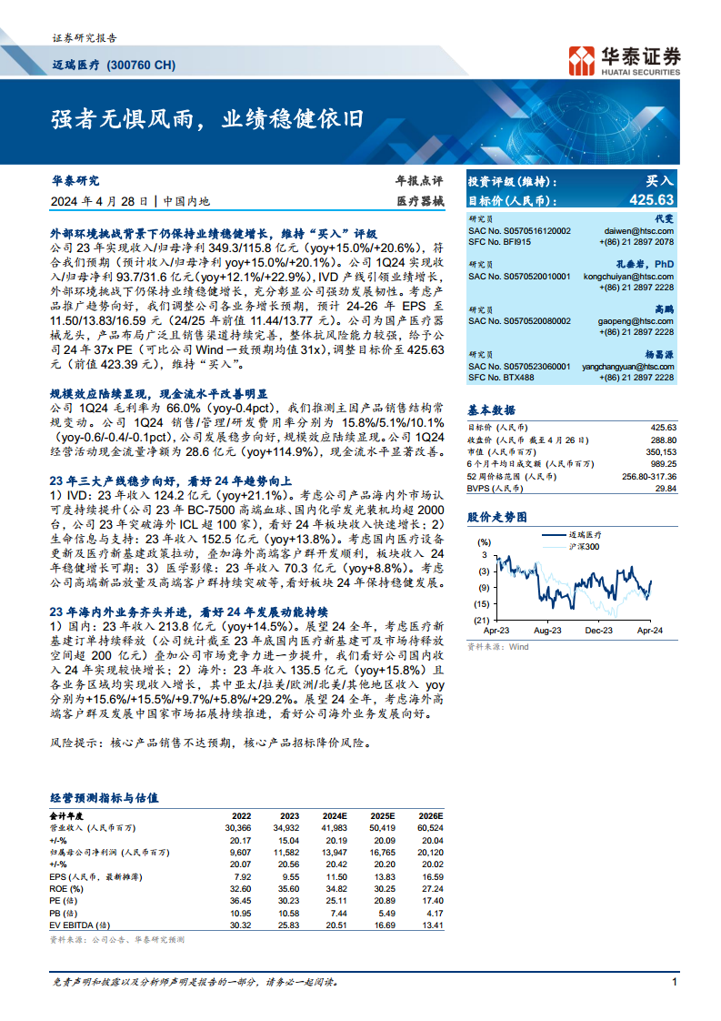 迈瑞医疗在2023年及2024年第一季度展现出卓越的经营韧性和稳健的业绩增长,其收入和归母净利润均符合市场预期。公司通过精细化管理和规模效应,有效提升了运营效率并显著改善了现金流状况。展望未来,在体外诊断、生命信息与支持、医学影像三大核心业务线的持续创新和市场拓展,以及国内外市场(特别是国内医疗新基建和海外高端市场)的共同驱动下,迈瑞医疗的业绩增长动能强劲。尽管存在核心产品销售不达预期和招标降价的风险,但作为国产医疗器械行业的领军企业,迈瑞医疗凭借其广泛的产品线和完善的销售网络,具备较强的抗风险能力。华泰研究基于对公司未来增长潜力的积极评估,维持“买入”评级,并上调目标价至425.63元。