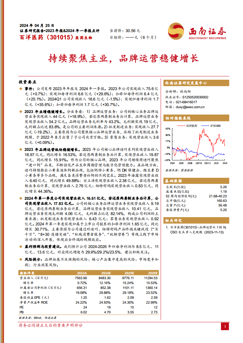 百洋医药(301015):持续聚焦主业,品牌运营稳健增长