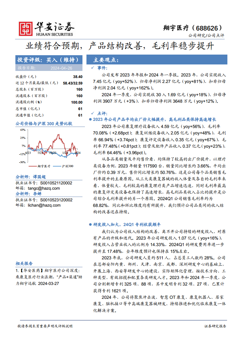 翔宇医疗在2023年及2024年一季度表现出强劲的业绩增长,主要得益于产品结构的持续优化、高毛利品类的高速增长以及产品平均出厂价的显著提升,从而带动了公司整体毛利率的稳步上扬。公司持续高强度的研发投入,不仅巩固了其技术领先地位,也为未来中高端康复器械的创新发展奠定了基础。同时,公司前瞻性地布局居家康复和海外市场,有望在未来1-2年内形成新的业绩增长点。鉴于公司在国内康复医疗器械领域的领军地位、全面的产品线、广泛的渠道覆盖和良好的成本控制能力,华安证券维持“买入”评级,并对其未来业绩增长持乐观预期。然而,投资者仍需关注新产品推广、行业竞争及临床采购需求等潜在风险。