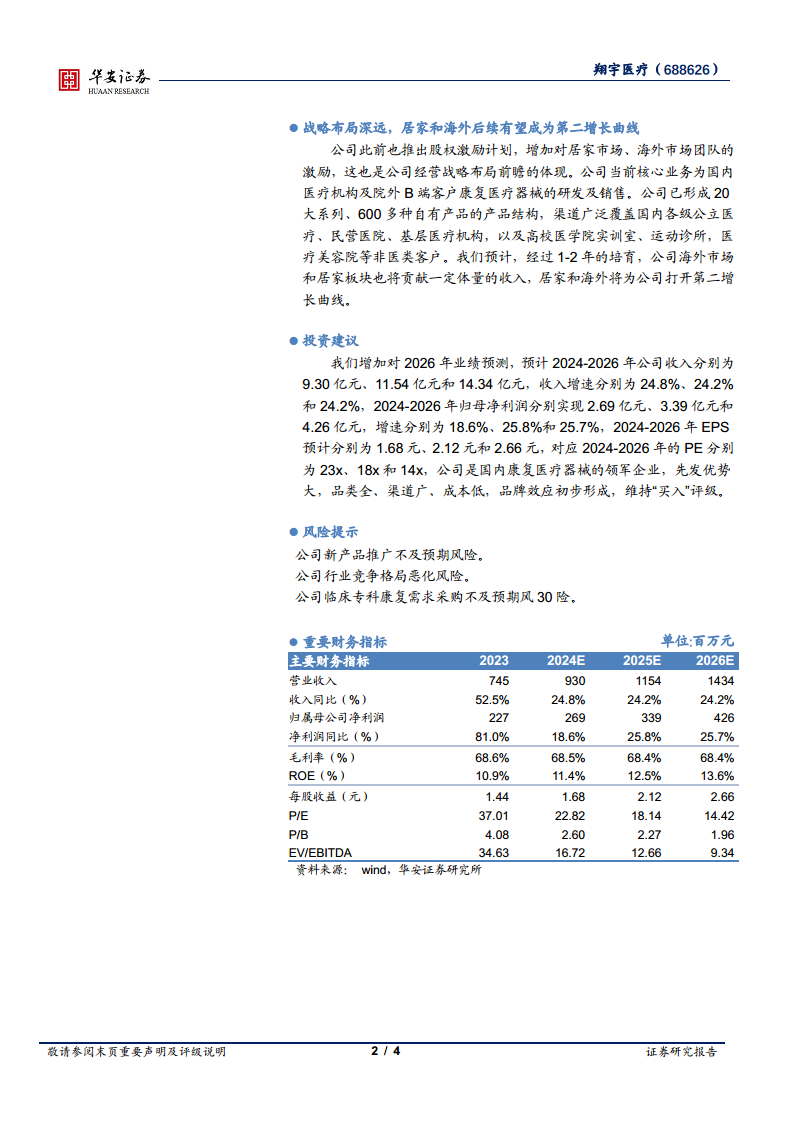 华安证券维持对翔宇医疗的“买入”评级。预计2024-2026年公司收入分别为9.30亿元、11.54亿元和14.34亿元,收入增速分别为24.8%、24.2%和24.2%。同期归母净利润预计分别为2.69亿元、3.39亿元和4.26亿元,增速分别为18.6%、25.8%和25.7%。对应的2024-2026年EPS预计分别为1.68元、2.12元和2.66元,PE分别为23x、18x和14x。公司作为国内康复医疗器械的领军企业,具备先发优势、品类齐全、渠道广泛、成本控制良好以及初步形成的品牌效应。