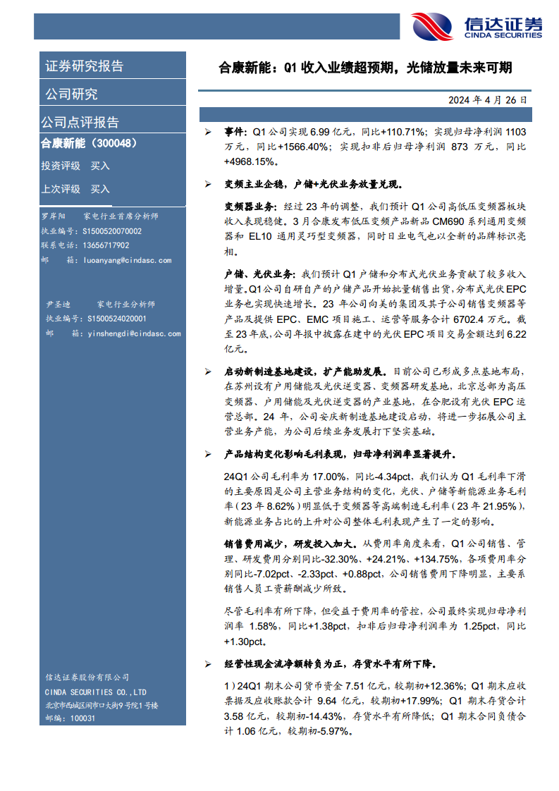 合康新能2024年第一季度表现亮眼,营收和净利润均实现超预期增长,主要得益于户用储能和分布式光伏等新能源业务的快速放量。公司通过新制造基地建设扩大产能,并有效实施费用管控,尽管产品结构变化导致毛利率有所下降,但归母净利润率显著提升,经营性现金流转正,存货水平降低,显示出良好的运营效率和财务健康状况。展望未来,在变频器主业企稳回暖和新能源业务持续兑现的共同驱动下,公司业绩增长前景广阔,信达证券维持“买入”评级。