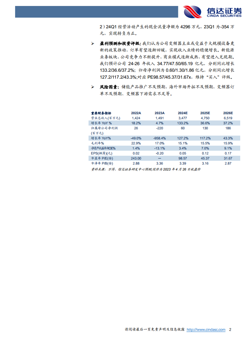 信达证券预计,公司变频器主业有望受益于大规模设备更新政策的推动,订单将逐渐回暖,实现稳健增长。新能源业务板块,公司竞争力持续提升,商业模式日益成熟,有望进入业绩兑现期。