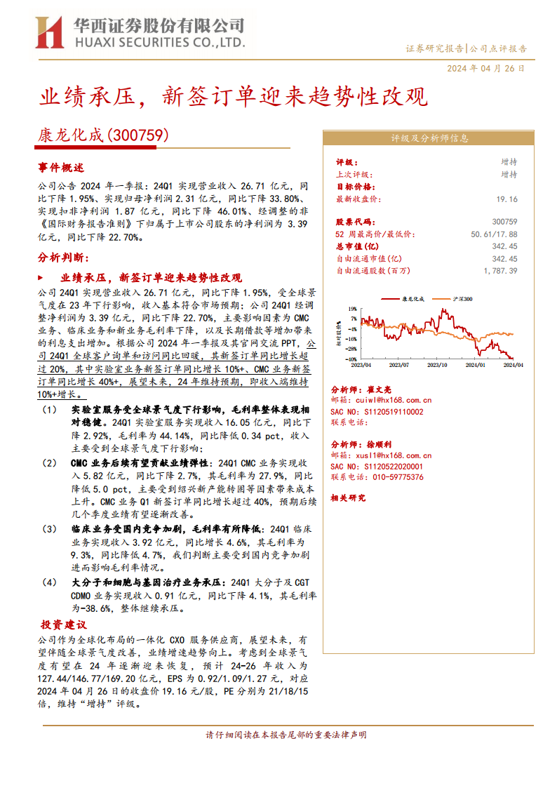 康龙化成2024年第一季度业绩面临压力,营收同比微降1.95%,归母净利润同比下降33.80%,主要受全球景气度下行、部分业务毛利率降低及利息支出增加影响。然而,公司在全球客户询单和访问量回暖的背景下,新签订单实现超过20%的同比增长,其中CMC业务新签订单增长超40%,实验室业务增长超10%,这预示着公司未来业绩有望迎来趋势性改善。