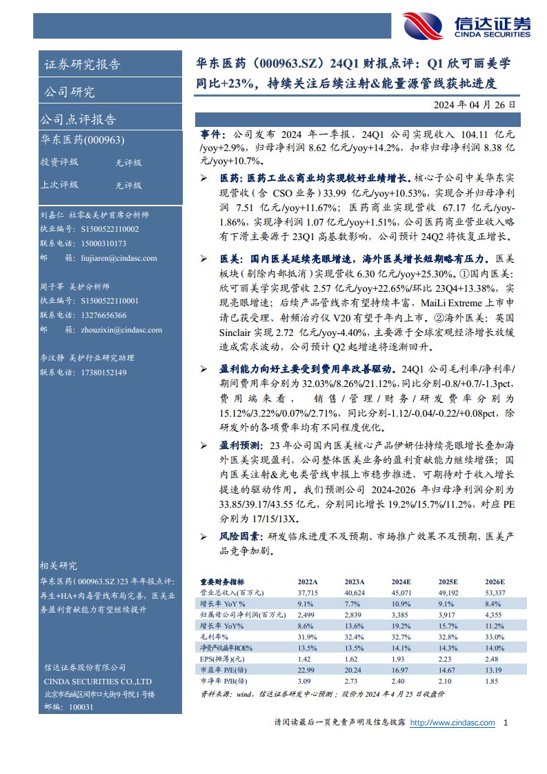华东医药(000963):24Q1财报点评:Q1欣可丽美学:同比+23%,持续关注后续注射、能量源管线获批进度