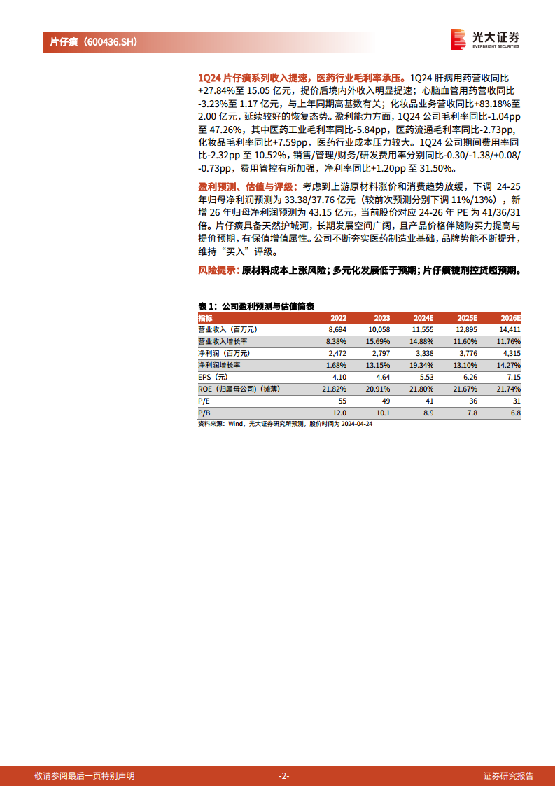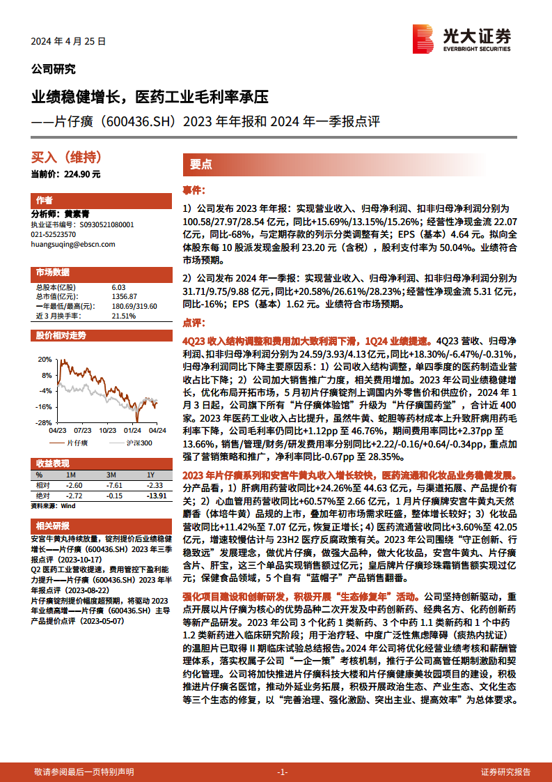 片仔癀(600436):2023年年报和2024年一季报点评:业绩稳健增长,医药工业毛利率承压