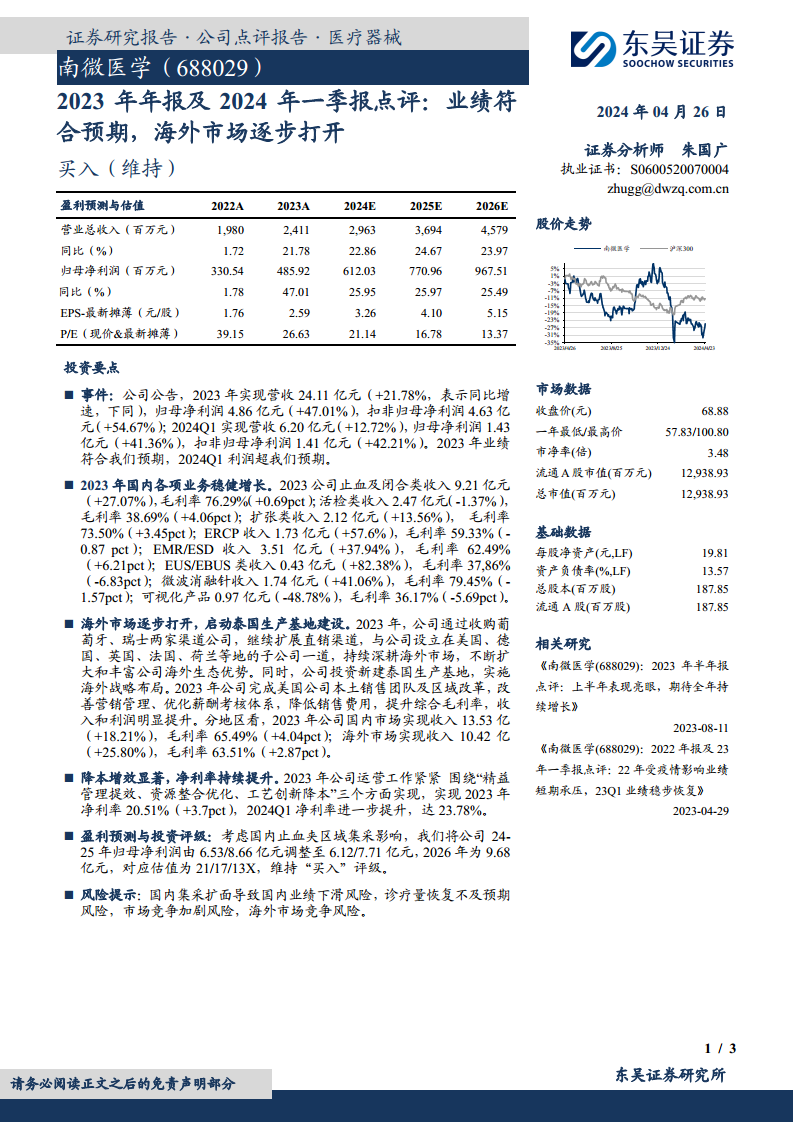 南微医学(688029):2023年年报及2024年一季报点评:业绩符合预期,海外市场逐步打开