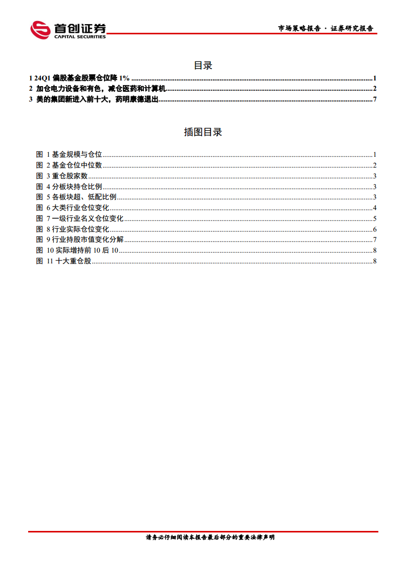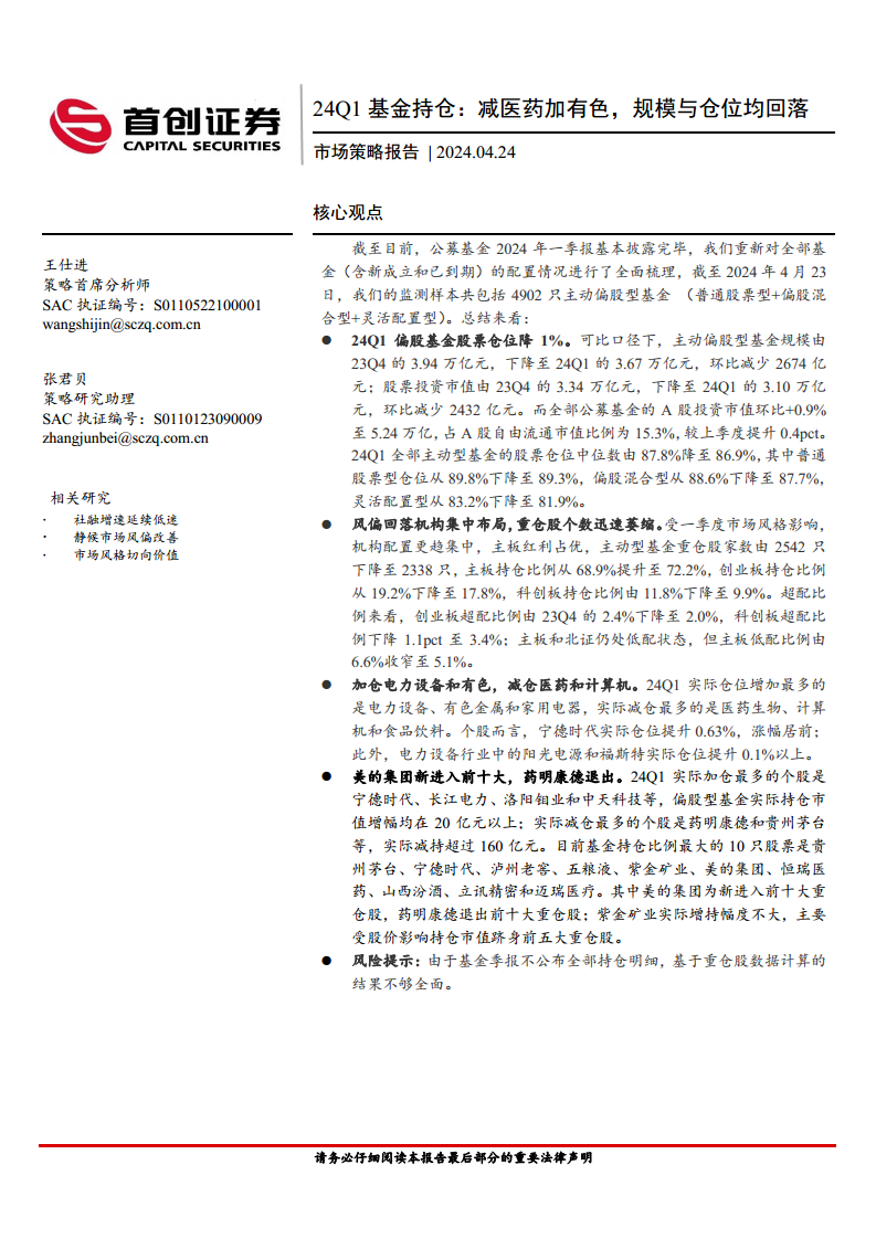 24Q1基金持仓:减医药加有色,规模与仓位均回落