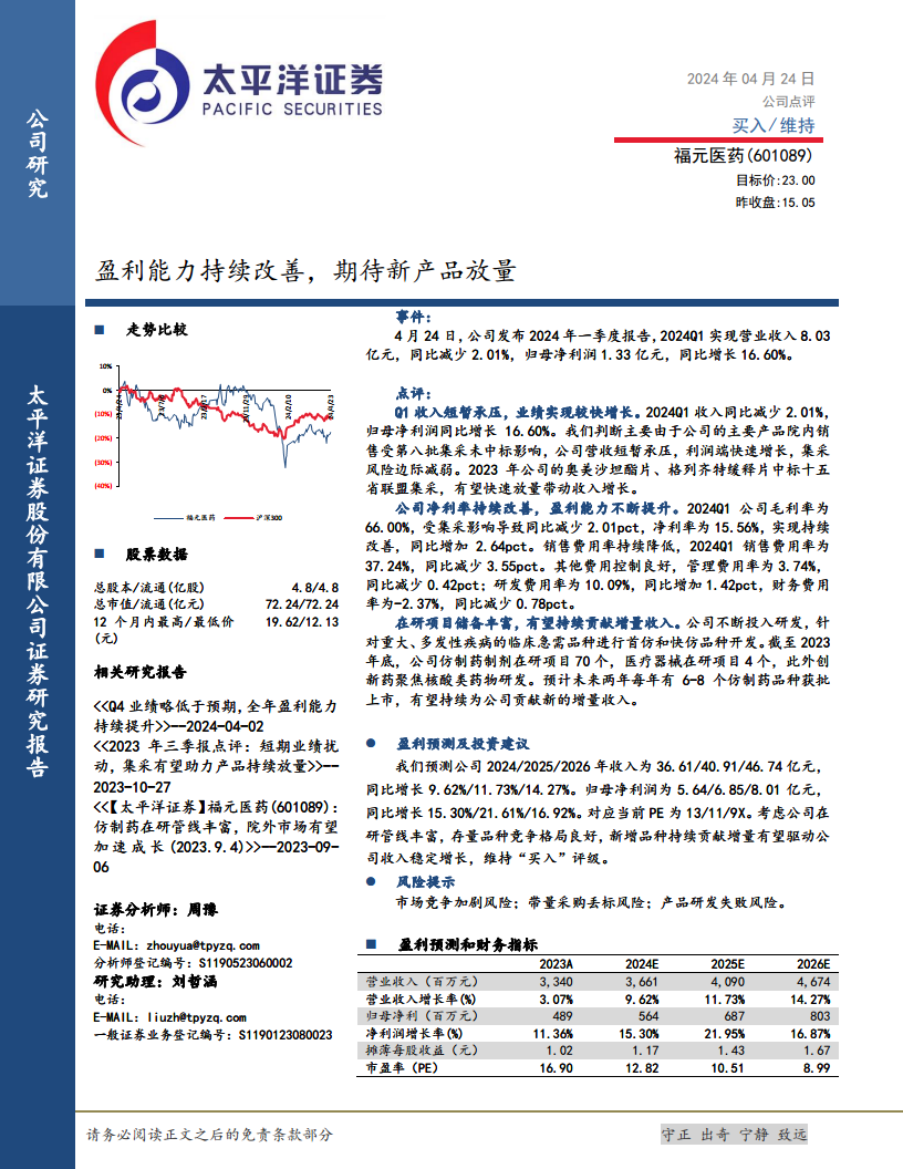 福元医药在2024年第一季度展现出强劲的盈利韧性,尽管营收因集采影响短期承压,但归母净利润实现显著增长,净利率持续改善,各项费用控制得当。公司在2023年成功中标的集采品种以及丰富的在研管线,特别是预计未来两年每年将有6-8个仿制药获批上市,为公司未来的收入增长提供了坚实基础。太平洋证券基于此维持“买入”评级,并预测公司未来几年将保持稳定的收入和利润增长。投资者需关注市场竞争、集采政策及研发进展等潜在风险。