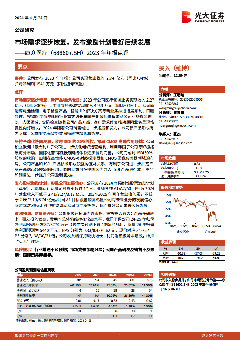 康众医疗在2023年实现了营收和净利润的双重增长,标志着市场需求的逐步恢复和公司经营策略的有效性。通过新产品的持续推进、全球化市场拓展以及对ISDI的战略性股权收购,公司在高端CMOS应用领域的技术实力和市场竞争力得到进一步提升。股权激励计划的发布,不仅展现了公司对未来发展的坚定信心,也为激发团队活力、实现长期目标奠定了基础。尽管面临较高的销售和研发投入带来的费用压力,导致短期盈利预测有所调整,但公司收入端的强劲增长势头和积极的战略布局,使其仍具备良好的发展潜力,维持“买入”评级。投资者需关注行业增速、市场竞争、产品研发及国际贸易环境等潜在风险。