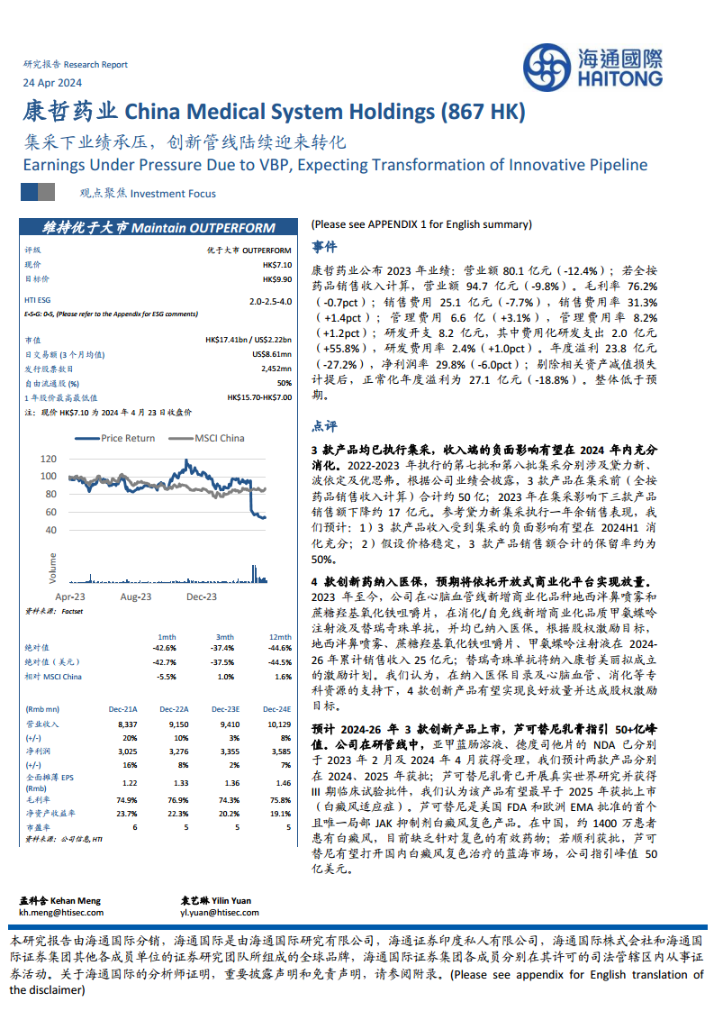 康哲药业2023年业绩受国家药品集中采购(VBP)影响显著承压,营收和净利润均低于预期。然而,报告核心观点指出,集采对现有产品的负面影响预计将在2024年内充分消化。