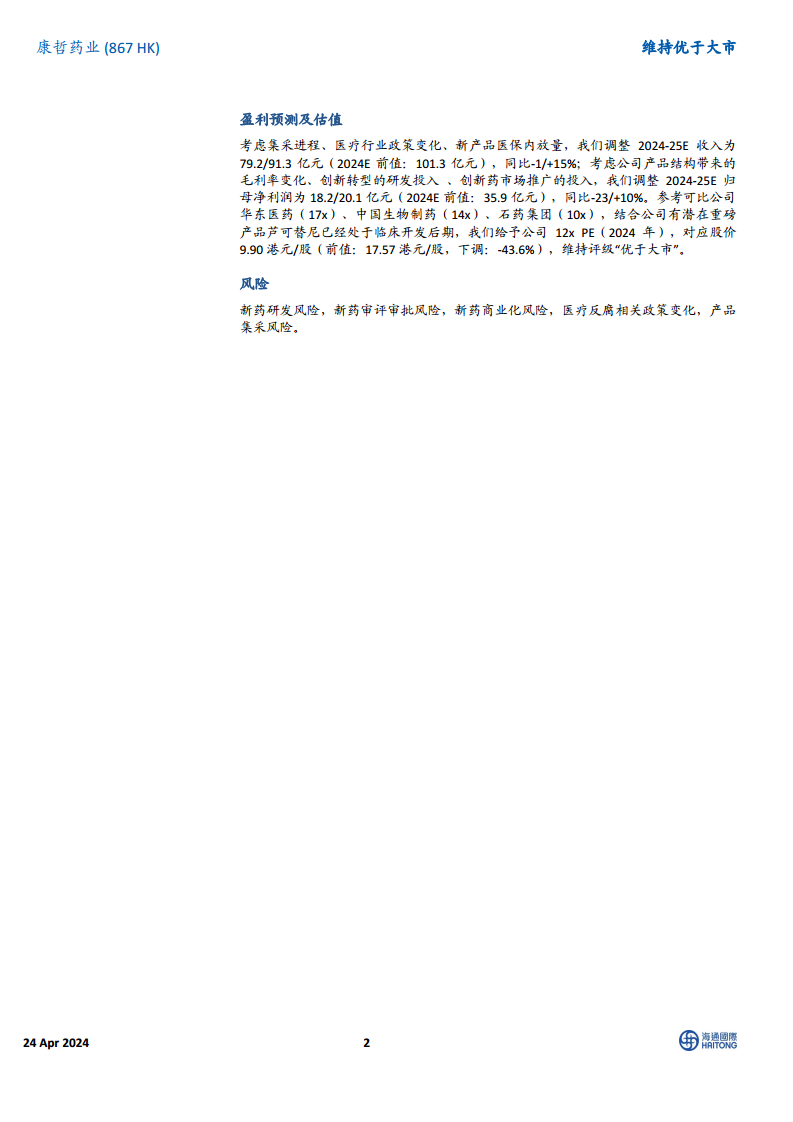 基于集采进程、医疗行业政策变化、新产品医保内放量以及创新转型带来的研发和市场推广投入,报告调整了康哲药业2024-2025年的收入预测至79.2亿元/91.3亿元(原2024E为101.3亿元),同比分别为-1%/+15%。归母净利润预测调整至18.2亿元/20.1亿元(原2024E为35.9亿元),同比分别为-23%/+10%。尽管盈利预测下调,但考虑到公司潜在的重磅产品芦可替尼已处于临床开发后期,报告维持“优于大市”的投资评级,并将目标价调整至9.90港元/股(原17.57港元/股,下调43.6%)。主要风险包括新药研发风险、审评审批风险、商业化风险、医疗反腐相关政策变化以及产品集采风险。