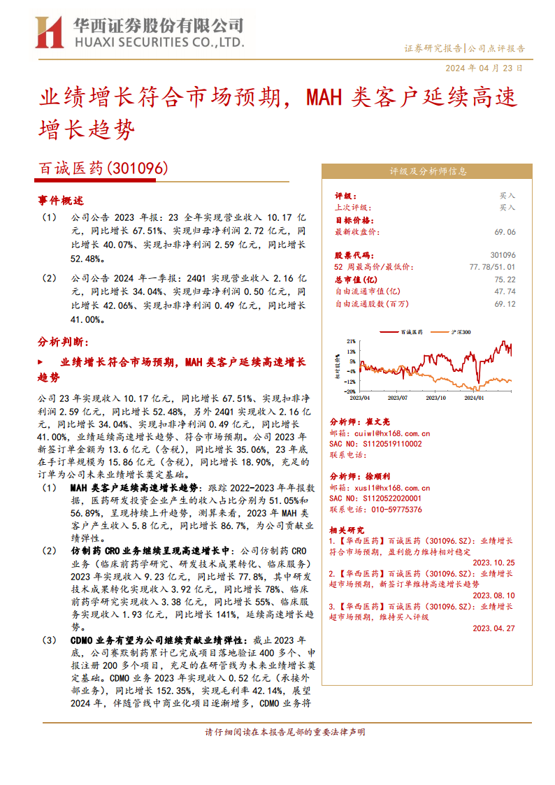 百诚医药(301096):业绩增长符合市场预期,MAH类客户延续高速增长趋势