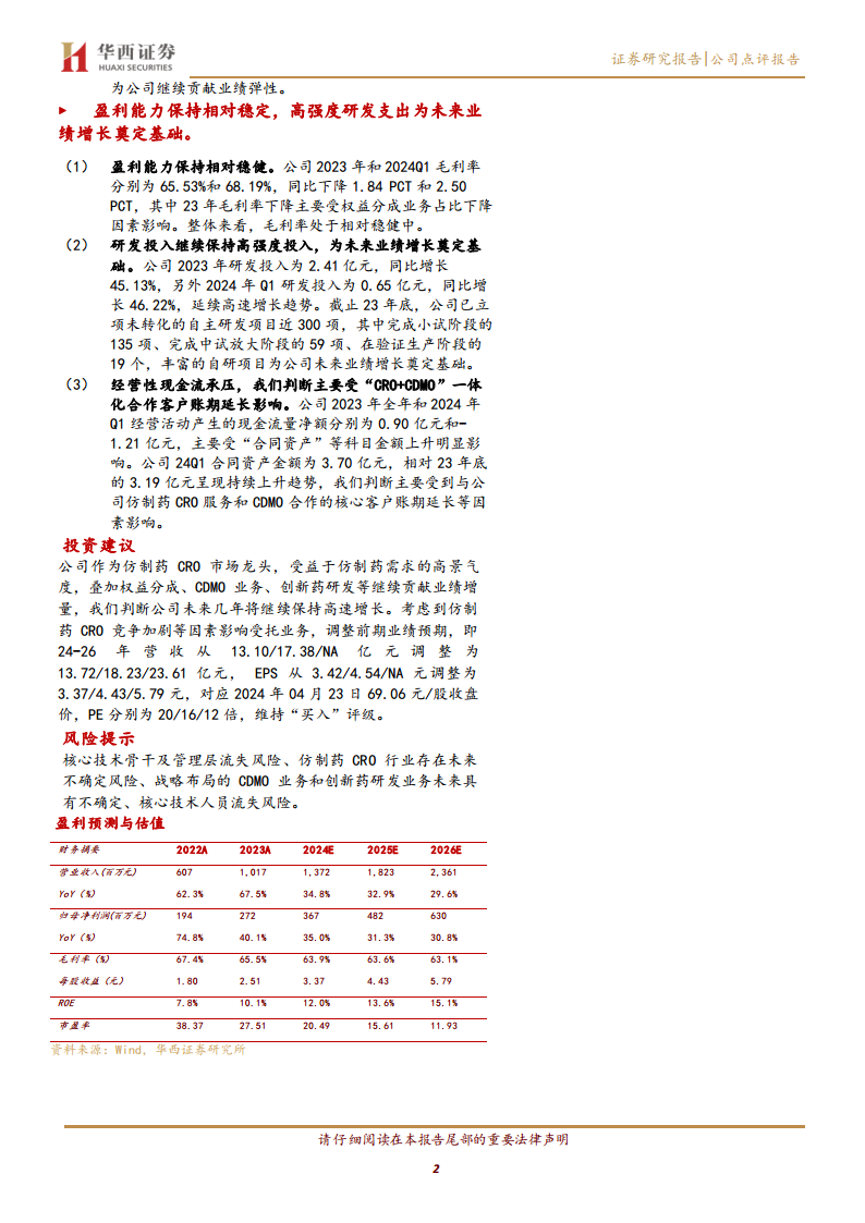 公司业绩增长主要得益于MAH(药品上市许可持有人)类客户业务的持续高速增长,以及仿制药CRO(合同研究组织)核心业务的强劲表现。MAH类客户收入占比持续提升,成为公司业绩弹性的重要贡献者。同时,CDMO(合同开发与制造组织)业务也展现出巨大的增长潜力,有望在未来贡献更多业绩增量。公司持续高强度的研发投入,积累了丰富的自主研发项目管线,为长期发展提供了动力,尽管短期内经营性现金流面临一定压力,但整体盈利能力保持相对稳定。基于此,分析师维持“买入”评级,并上调了未来几年的盈利预测。