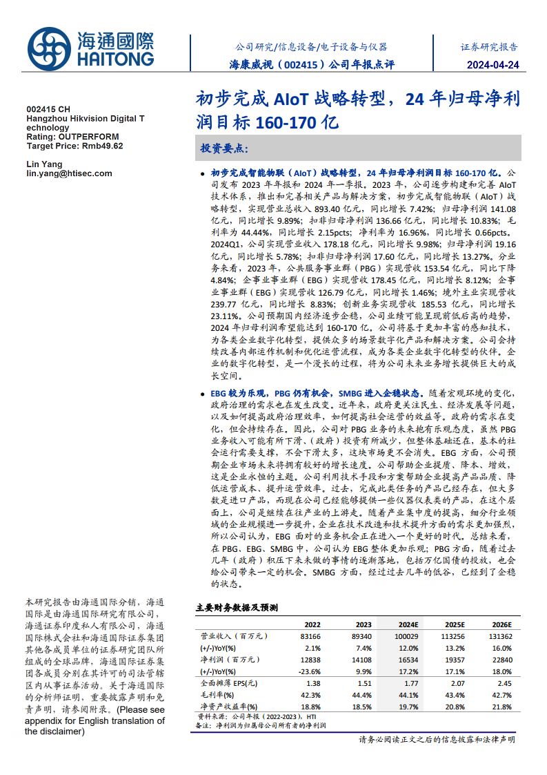 海康威视(002415):初步完成AIoT战略转型,24年归母净利润目标160-170亿