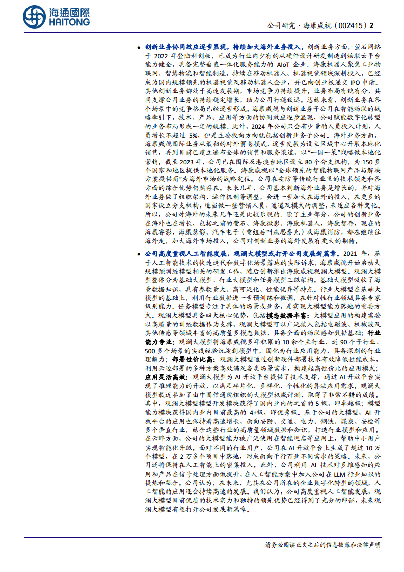 公司在企业事业群(EBG)市场表现乐观,公共服务事业群(PBG)和中小企业事业群(SMBG)也展现出新的发展机遇。同时,创新业务的协同效应日益显著,海外市场投入持续加大,为公司提供了多元化的增长动力。特别值得关注的是,海康威视高度重视人工智能发展,其“观澜大模型”在行业评测中表现卓越,凭借丰富的模态数据、专业的行业能力、高性价比的部署和灵活高效的应用,有望开启公司发展的新篇章。