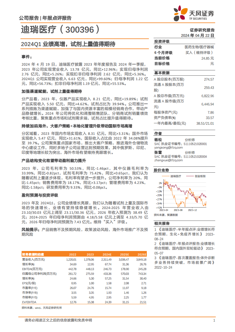 迪瑞医疗在2023年及2024年第一季度展现出强劲的业绩增长势头,尤其2024年第一季度营收同比实现近翻倍增长。这一显著表现主要得益于公司在试剂业务上的渠道赋能策略以及国际市场的持续深耕和本地化管理升级。随着高毛利的试剂产品占比提升和海外市场的快速扩张,公司整体盈利能力有望进一步增强。天风证券维持“买入”评级,并上调了未来三年的盈利预测,显示出对公司未来发展的坚定信心。