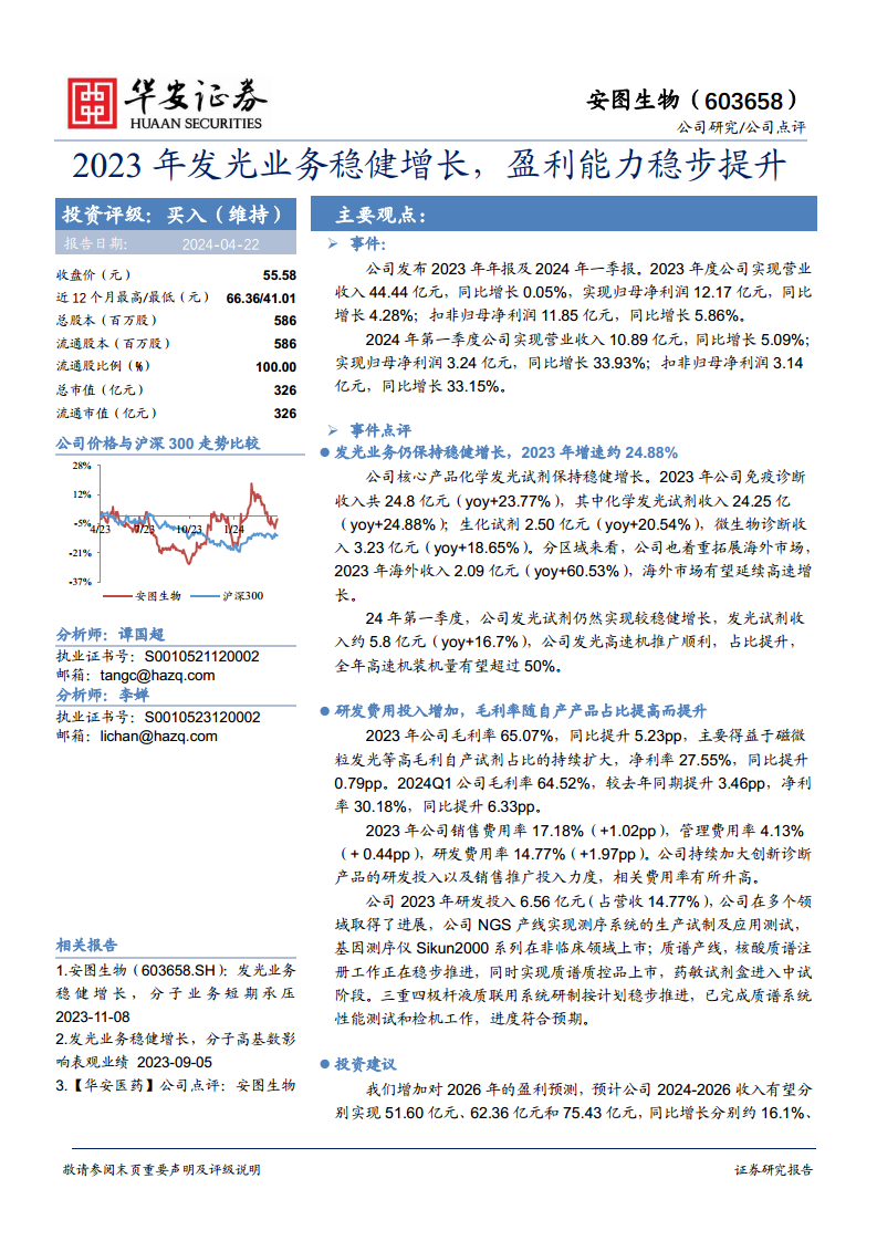 安图生物(603658):2023年发光业务稳健增长,盈利能力稳步提升