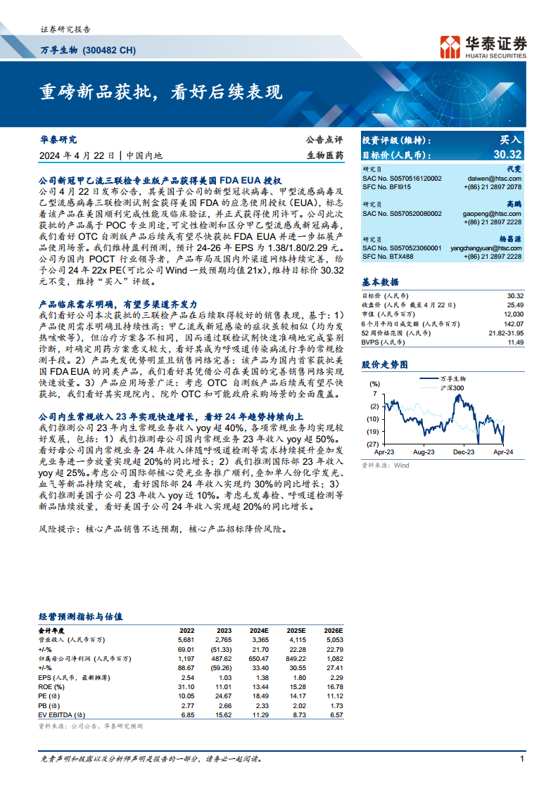 万孚生物凭借其重磅三联检新品获得美国FDA EUA授权,在呼吸道传染病检测市场占据先发优势,并有望通过多渠道拓展实现销售放量。同时,公司2023年内生常规业务实现快速增长,预计2024年将延续强劲增长态势,各项业务板块均展现出良好的发展前景。综合来看,公司在产品创新、市场拓展和内生增长方面均表现出色,华泰研究维持“买入”评级,并看好其后续表现。投资者需关注核心产品销售不及预期及招标降价的风险。