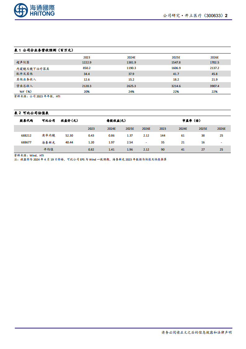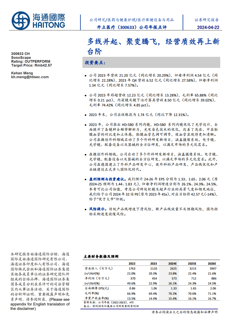 分析师预计开立医疗2024-2026年每股收益(EPS)分别为1.33元、1.65元和2.06元。考虑到公司在软镜及超声行业的高景气度和领先地位,给予公司2024年32倍市盈率(P/E),对应目标价42.57元,并维持“优于大市”的投资评级。
