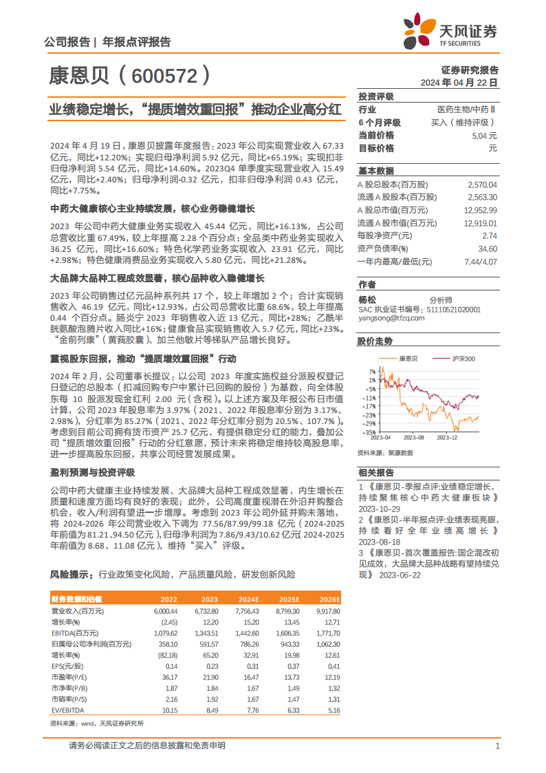 康恩贝高度重视股东回报,2024年2月,公司董事长提议以2023年度实施权益分派股权登记日总股本为基数,向全体股东每10股派发现金红利2.00元(含税)。根据此方案及年报公布日市值计算,公司2023年股息率达到3.97%,显著高于2021年的3.17%和2022年的2.98%。同时,2023年分红率高达85.27%。公司目前拥有25.7亿元的货币资产,具备提供稳定高分红的能力,结合“提质增效重回报”行动,预计未来将持续维持较高股息率,进一步提升股东回报。