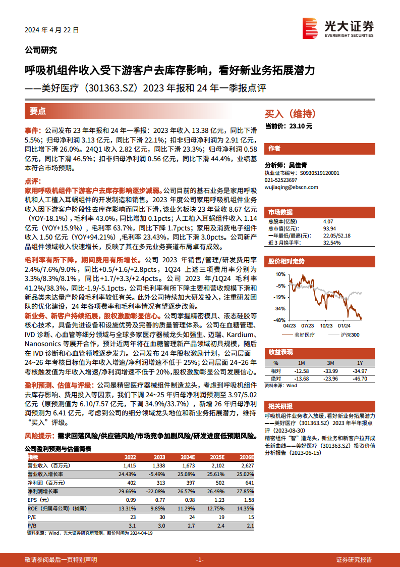 美好医疗在2023年及2024年一季度面临下游客户去库存和期间费用增长带来的业绩压力,导致收入和净利润下滑。公司核心的家用呼吸机组件业务受影响较大,但人工植入耳蜗组件和家用及消费电子组件业务实现增长,特别是新产品组件展现出快速发展势头。公司正积极拓展血糖管理、IVD诊断、心血管等新业务领域,并与全球医疗器械龙头建立合作,辅以股权激励计划,体现了对未来增长的坚定信心。尽管分析师下调了短期盈利预测,但基于公司在精密医疗器械组件制造领域的龙头地位和新业务的巨大潜力,维持“买入”评级。公司未来发展需关注需求回落、供应链、市场竞争及研发进度等风险。