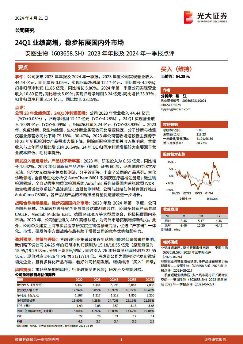 安图生物(603658):2023年年报及2024年一季报点评:24Q1业绩高增,稳步拓展国内外市场