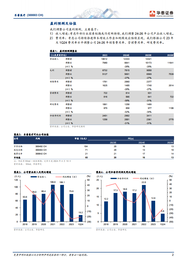 考虑到外部行业因素短期内可能仍将持续,华泰研究对乐普医疗2024-2026年的归母净利润预测进行了调整,分别下调至20.01亿元、23.61亿元和27.70亿元(2024/2025年前值分别为29.02亿元/34.11亿元)。