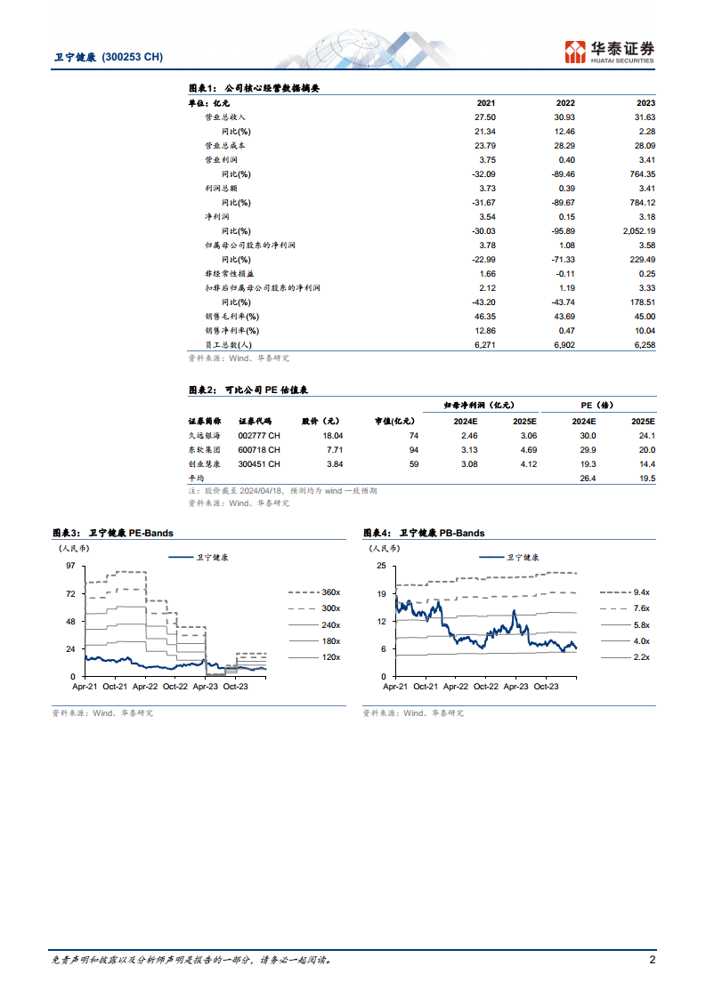 卫宁健康2023年实现营业收入31.63亿元,同比增长2.28%;归母净利润3.58亿元,同比增长230.11%。其中,23Q4营业收入12.62亿元,同比增长3.32%,归母净利润2.06亿元,实现同比由亏转盈。2023年经营性现金流为1.85亿元,较2022年的1亿元有显著改善。华泰研究预计公司2024-2026年归母净利润分别为5.77亿元、7.66亿元和9.72亿元,维持“增持”评级,目标价9.37元。