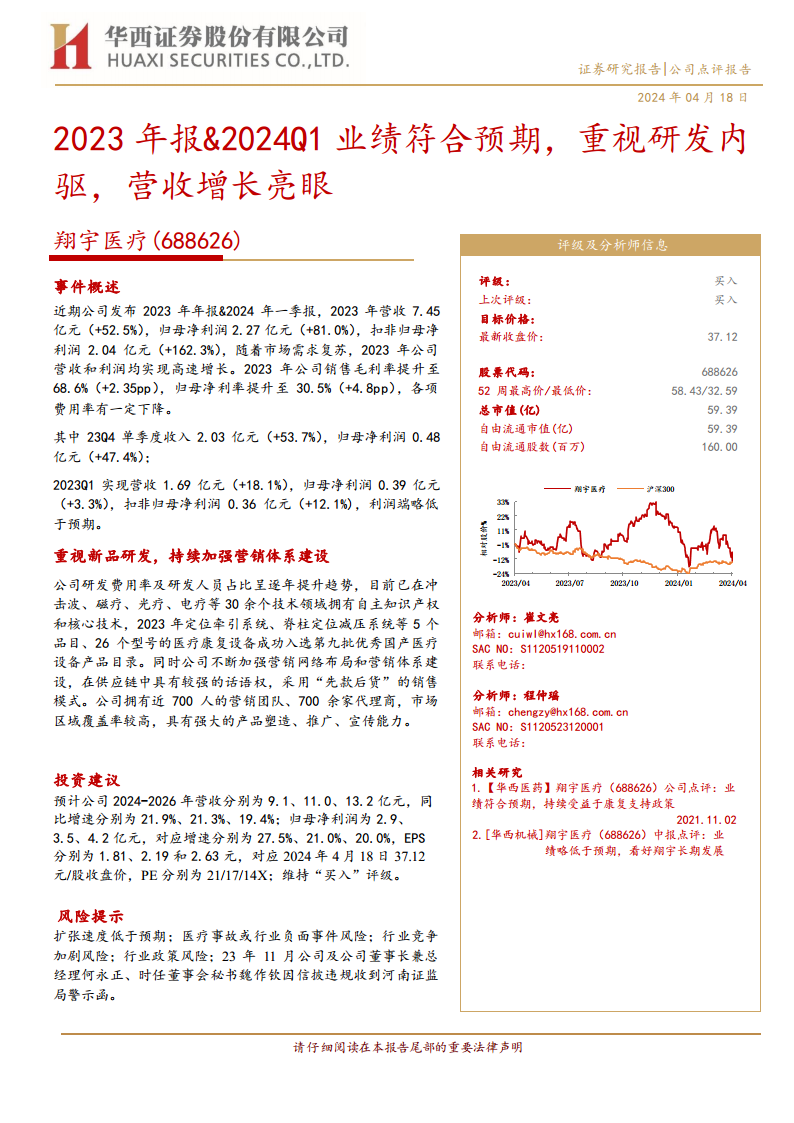 翔宇医疗在2023年展现出强劲的业绩增长,营收和归母净利润均实现高速增长,盈利能力显著提升。公司持续加大研发投入,不断推出创新产品并入选优秀国产医疗设备目录,同时通过完善的营销网络和“先款后货”模式有效拓展市场。尽管2024年第一季度利润增速略低于预期,但分析师对公司未来几年的营收和净利润增长持乐观态度,并维持“买入”评级。投资者在关注公司增长潜力的同时,也需警惕扩张速度、行业竞争、政策变化以及信息披露合规性等潜在风险。
