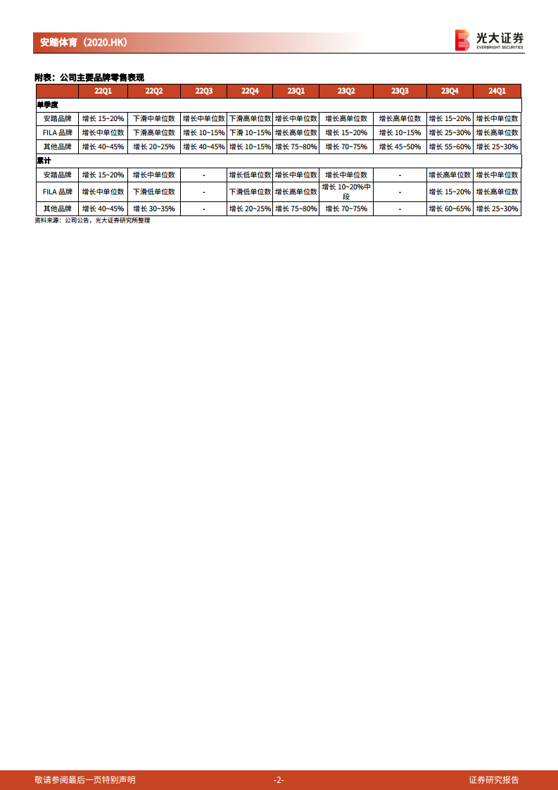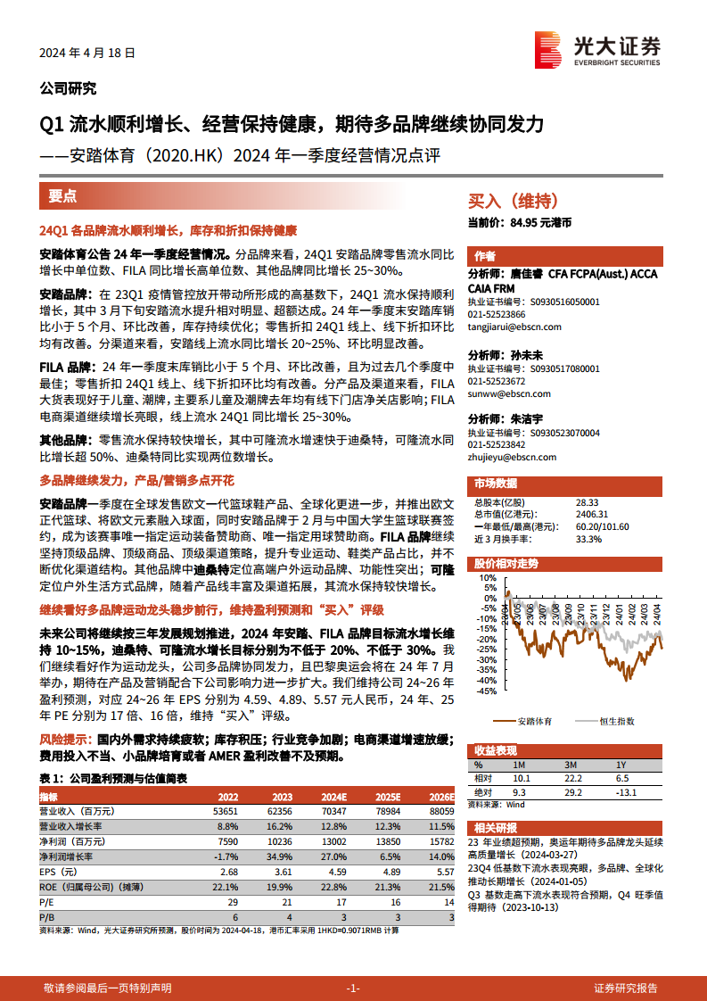 安踏体育在2024年第一季度展现了卓越的经营表现,旗下安踏、FILA及其他品牌均实现了零售流水的顺利增长,其中其他品牌增速尤为突出,达到25%至30%。公司在库存管理和零售折扣方面持续优化,保持了健康的经营状态,并通过线上渠道的强劲增长进一步巩固了市场地位。多品牌战略是公司成功的核心,安踏品牌通过全球化产品和营销合作提升影响力,FILA品牌坚持高端定位并优化渠道,迪桑特和可隆则凭借差异化策略实现快速增长。展望未来,公司设定了积极的增长目标,并有望借助巴黎奥运会进一步扩大品牌影响力。分析师维持“买入”评级,但同时提示了市场需求、库存、竞争加剧等潜在风险。总体而言,安踏体育作为多品牌运动龙头,展现出稳健的经营能力和持续的增长潜力,值得长期关注。