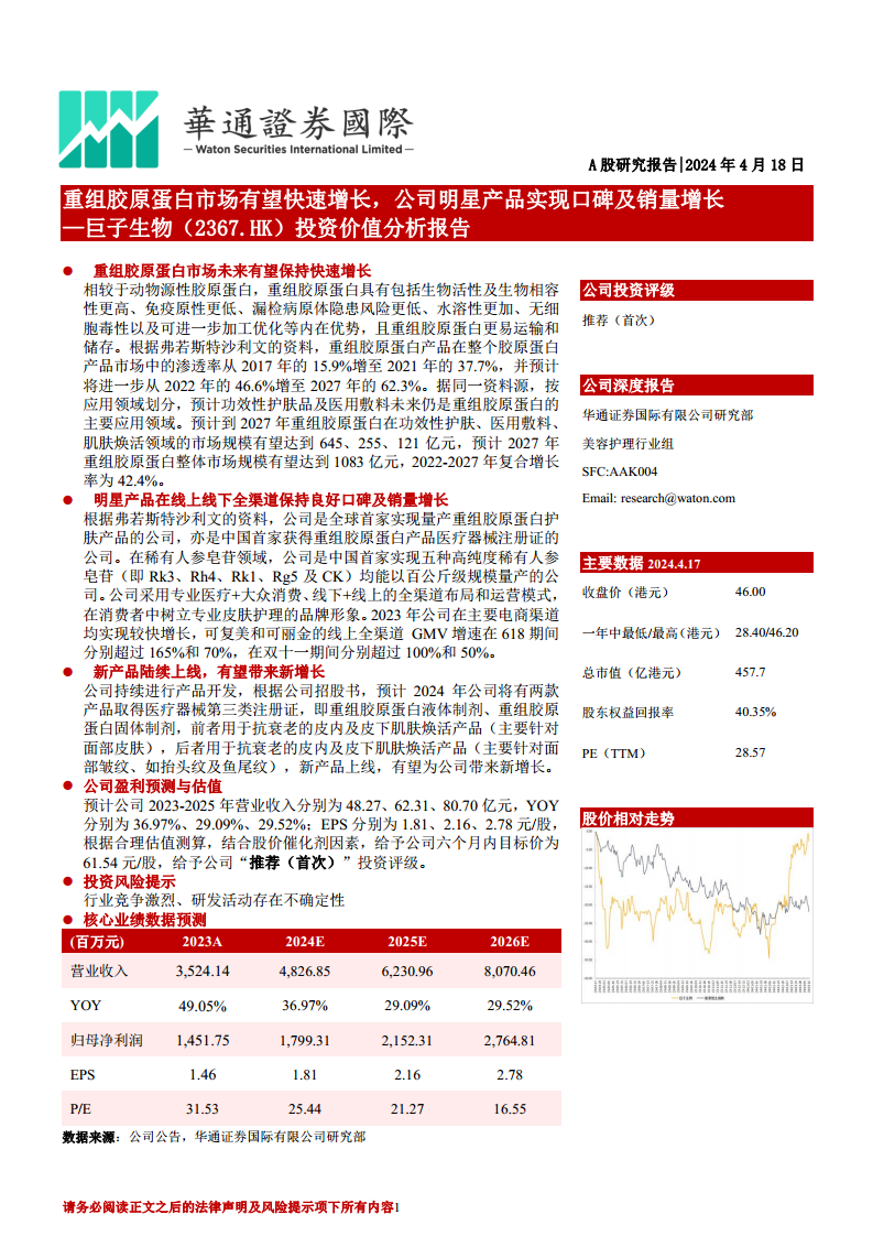 本报告深入分析了巨子生物(2367.HK)的投资价值,核心观点在于重组胶原蛋白市场正经历爆发式增长,其渗透率持续提升,预计到2027年整体市场规模将达到1083亿元,复合增长率高达42.4%。巨子生物作为该领域的先行者和领导者,凭借其在重组胶原蛋白和稀有人参皂苷技术上的领先优势,以及“专业医疗+大众消费、线下+线上”的全渠道布局,实现了明星产品的强劲增长和市场口碑的持续提升,奠定了其在行业中的核心竞争力。