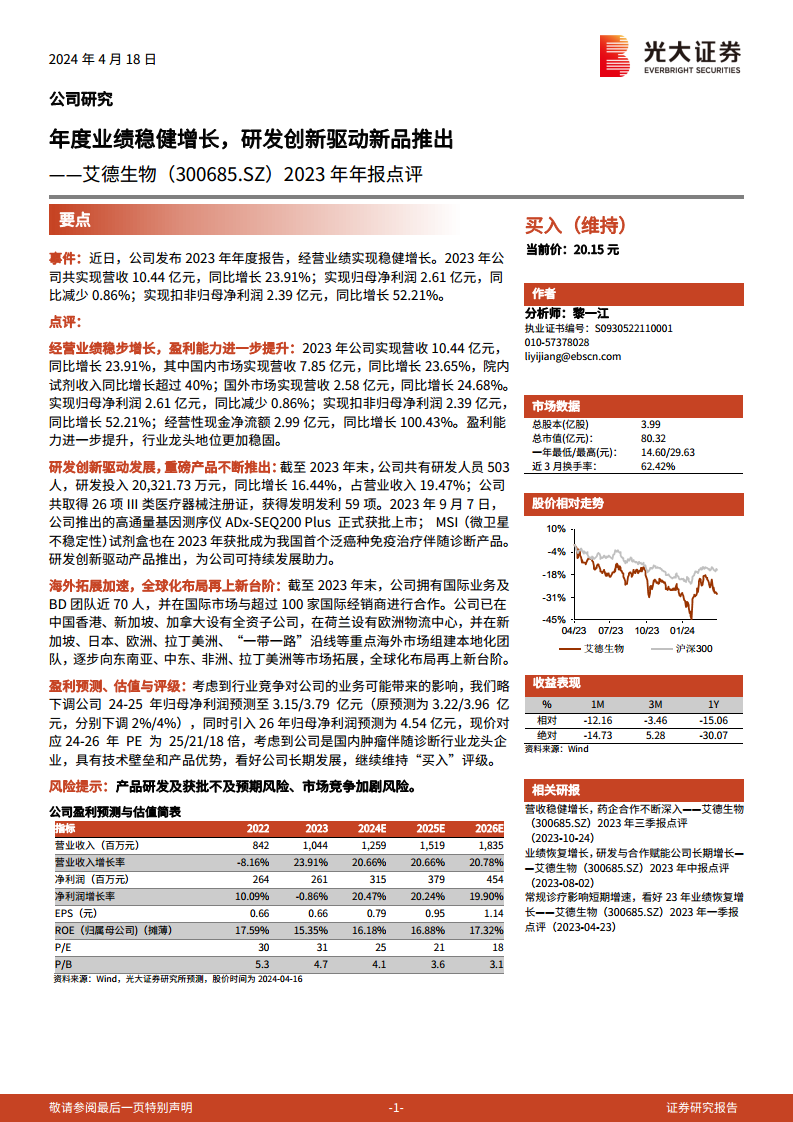 艾德生物2023年年度报告显示,公司在营收和扣非归母净利润方面均实现了稳健增长,尤其在扣非净利润和经营性现金流方面表现突出,核心业务盈利能力显著增强。公司持续高强度投入研发,成功推出多款重磅创新产品,巩固了其在肿瘤伴随诊断领域的领先地位。同时,艾德生物积极推进全球化战略,通过建立海外团队、拓展经销商网络和设立分支机构,加速国际市场布局。尽管分析师对短期盈利预测进行了微调,但基于公司强大的技术壁垒、产品优势和明确的全球化发展路径,仍维持“买入”评级,看好其长期发展潜力。公司面临产品研发及获批不及预期和市场竞争加剧的风险,但整体而言,其创新驱动和全球化拓展战略将持续助力其在伴随诊断市场的增长。