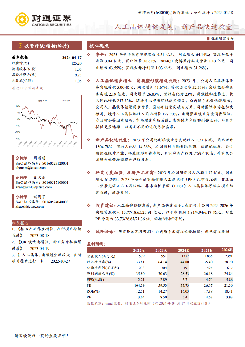 • 投资建议: 财通证券维持爱博医疗“增持”评级。基于人工晶体稳健发展和新产品快速放量的预期,预计公司2024-2026年营业收入将分别达到13.77亿元、18.65亿元和23.91亿元;归母净利润将分别达到3.91亿元、4.94亿元和6.17亿元。对应的PE分别为33.73倍、26.67倍和21.36倍。