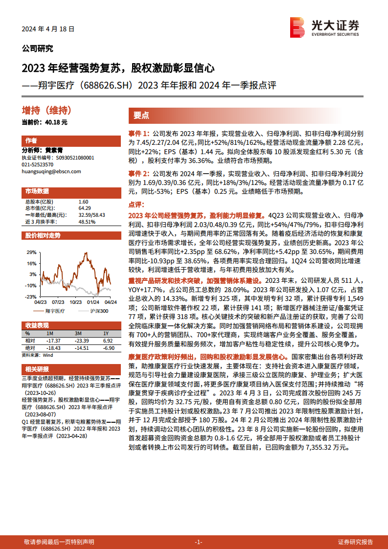 翔宇医疗(688626)2023年年报和2024年一季报点评:2023年经营强势复苏,股权激励彰显信心