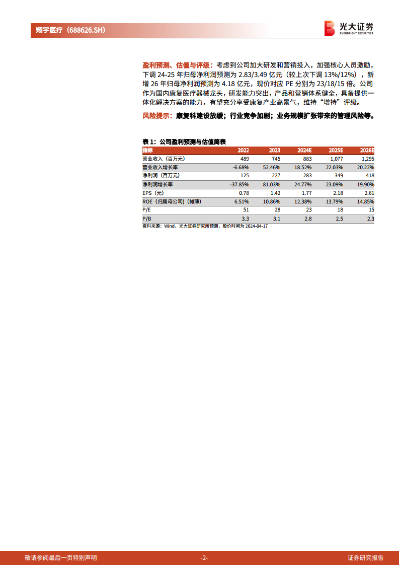 翔宇医疗在2023年实现了显著的经营复苏,营业收入和归母净利润分别同比增长52%和81%,盈利能力得到大幅修复,各项财务指标均创历史新高。公司通过持续加大研发投入,不断推出创新产品并完善全院临床康复一体化解决方案;同时,积极拓展营销网络,提升市场覆盖和服务质量,有效增强了核心竞争力。在国家康复医疗政策的持续利好下,公司通过股份回购和股权激励计划,充分展现了管理层对未来发展的坚定信心。尽管2024年一季度业绩增速受费用投放影响略有放缓,但分析师仍维持“增持”评级,强调公司作为康复医疗器械龙头,凭借其强大的研发实力和完善的营销体系,有望在康复产业高景气周期中持续受益,实现长期稳健增长。